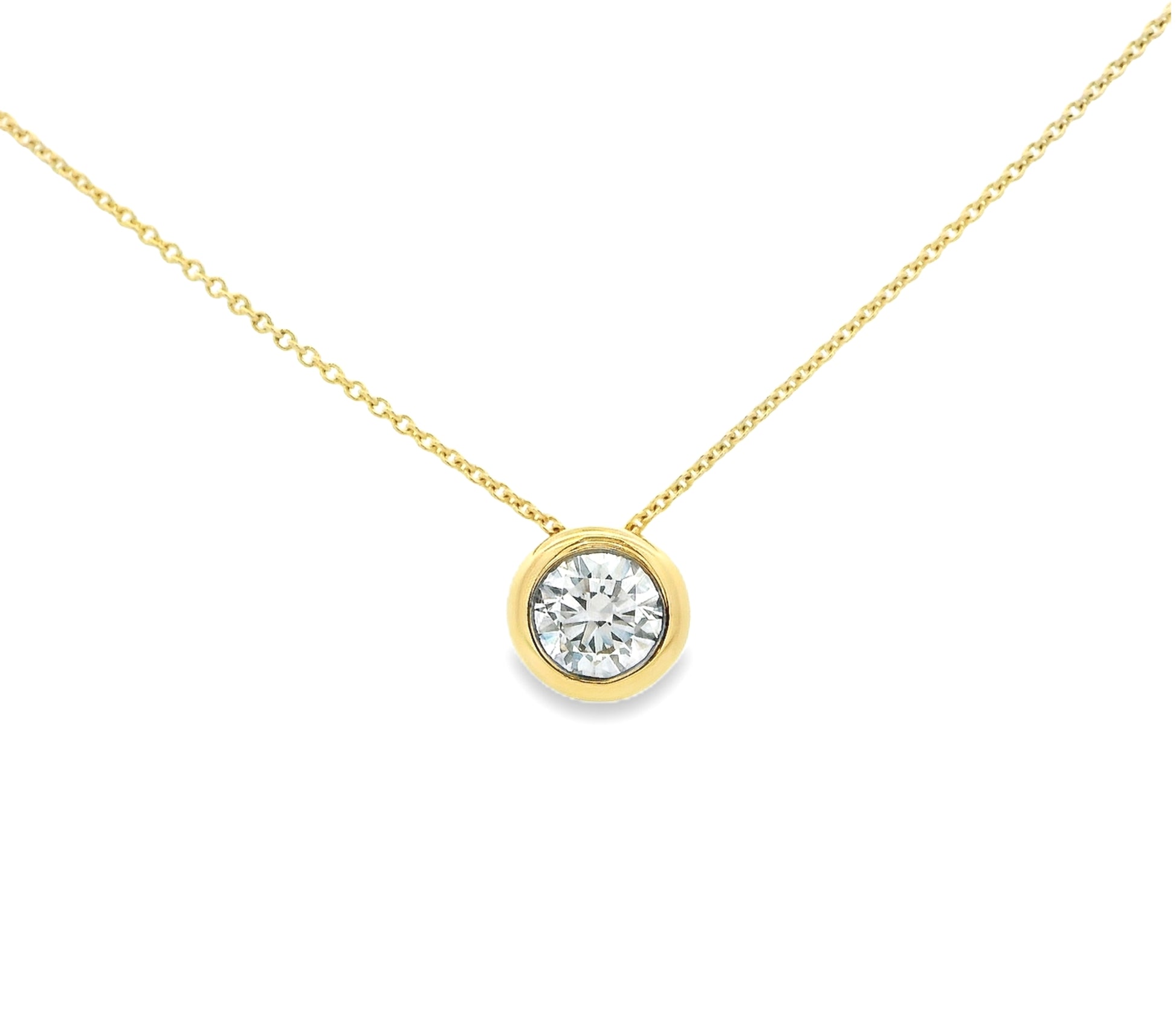 Half carat Round brilliant diamond surrounded by a yellow gold bezel flows smoothly on yellow gold chain.