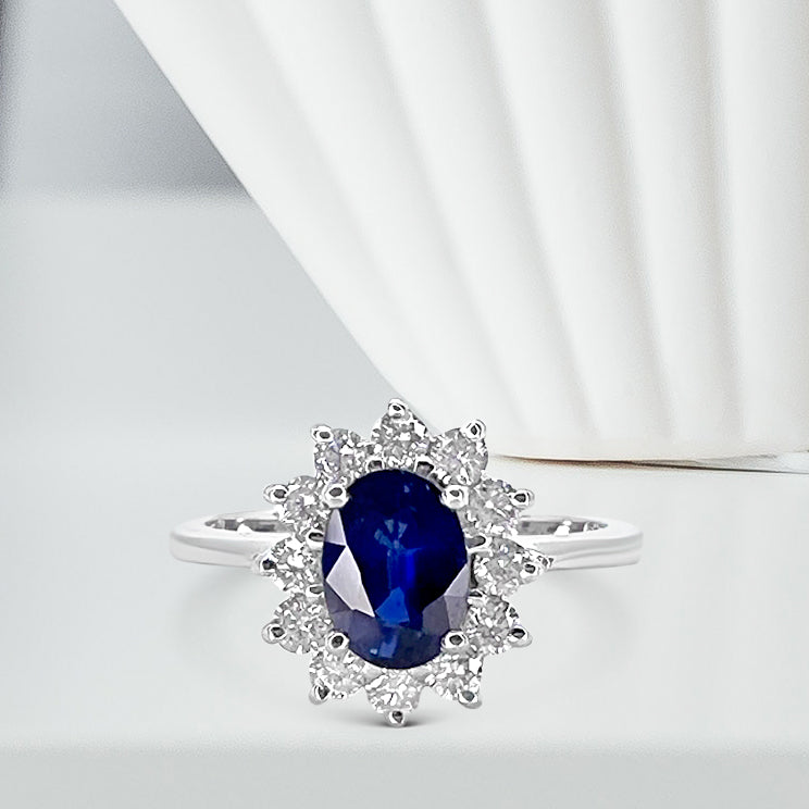 Oval Sapphire weighing approximately 1ct surrounded by round brilliant Diamonds weighing 0.42ctw in 14k white gold.