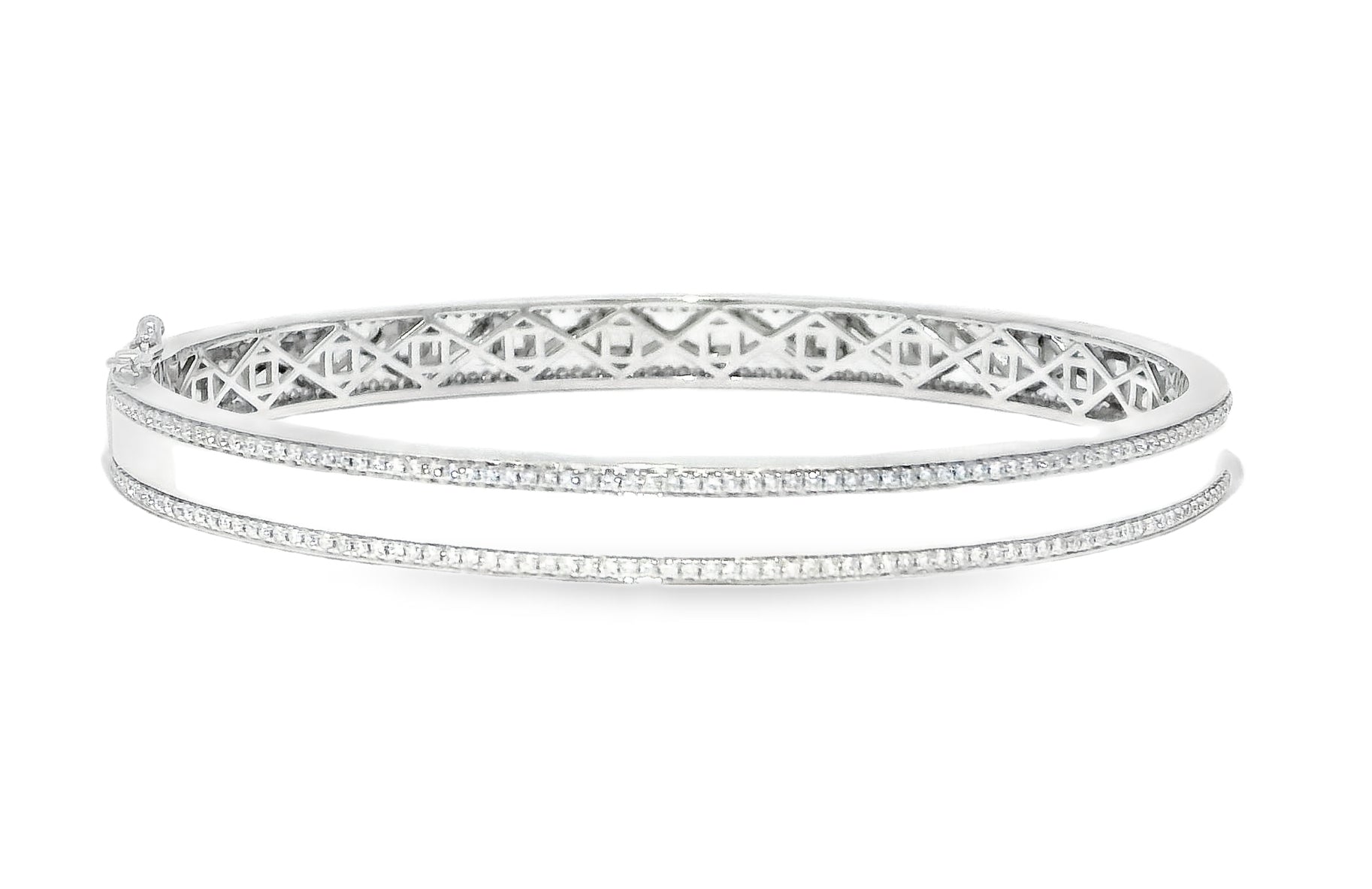 Available in Yellow, White or Rose gold, this sturdy bangle features a beautifully set row of diamonds on each edge surrounding the entire bangle. Hinged with lever clasp. Shown in 14k yellow and white gold.