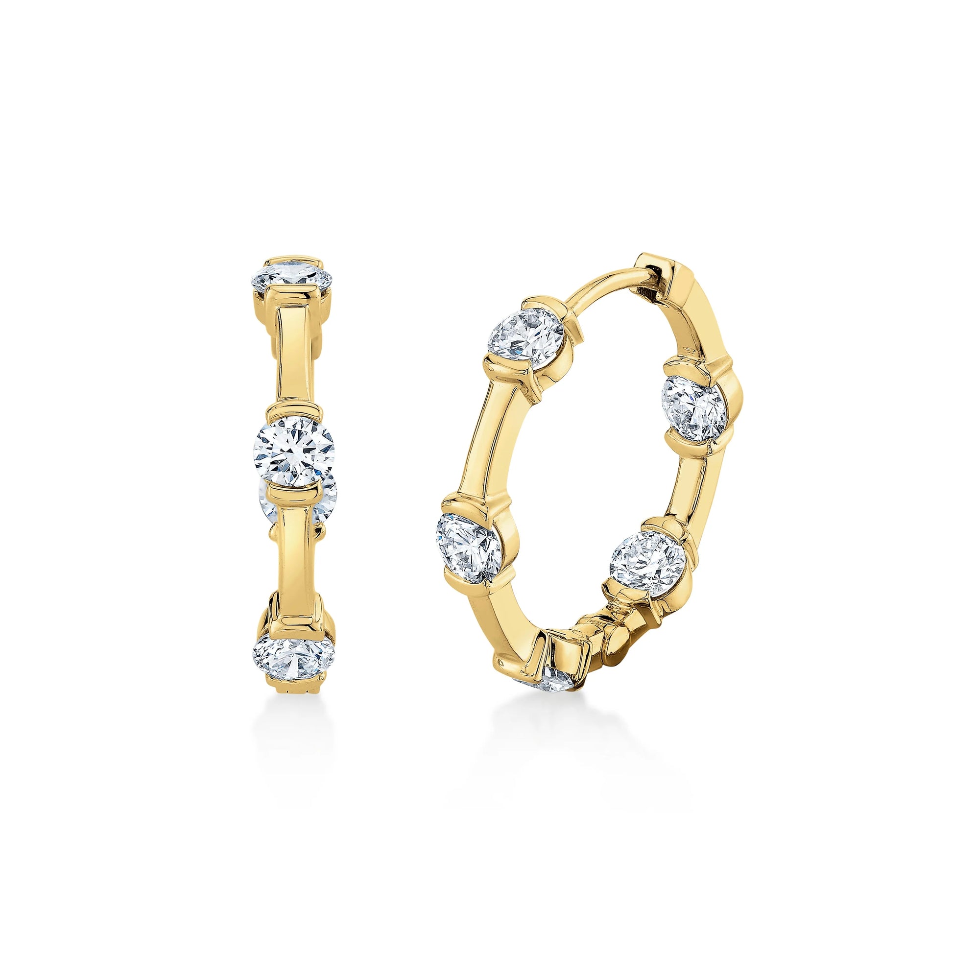 18k Yellow gold diamond hoop earrings in a beautiful bamboo pattern.