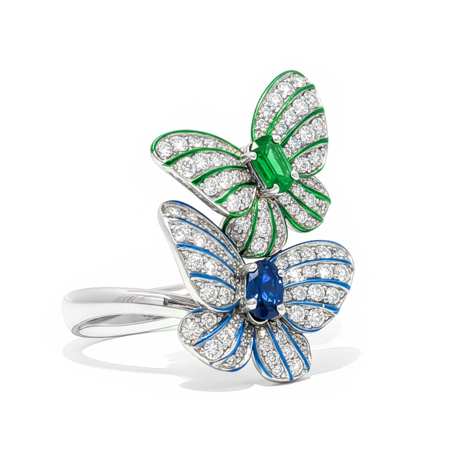 Double the flutter in this stunning 18k emerald & sapphire with diamond butterfly ring. Sure to make a statement.