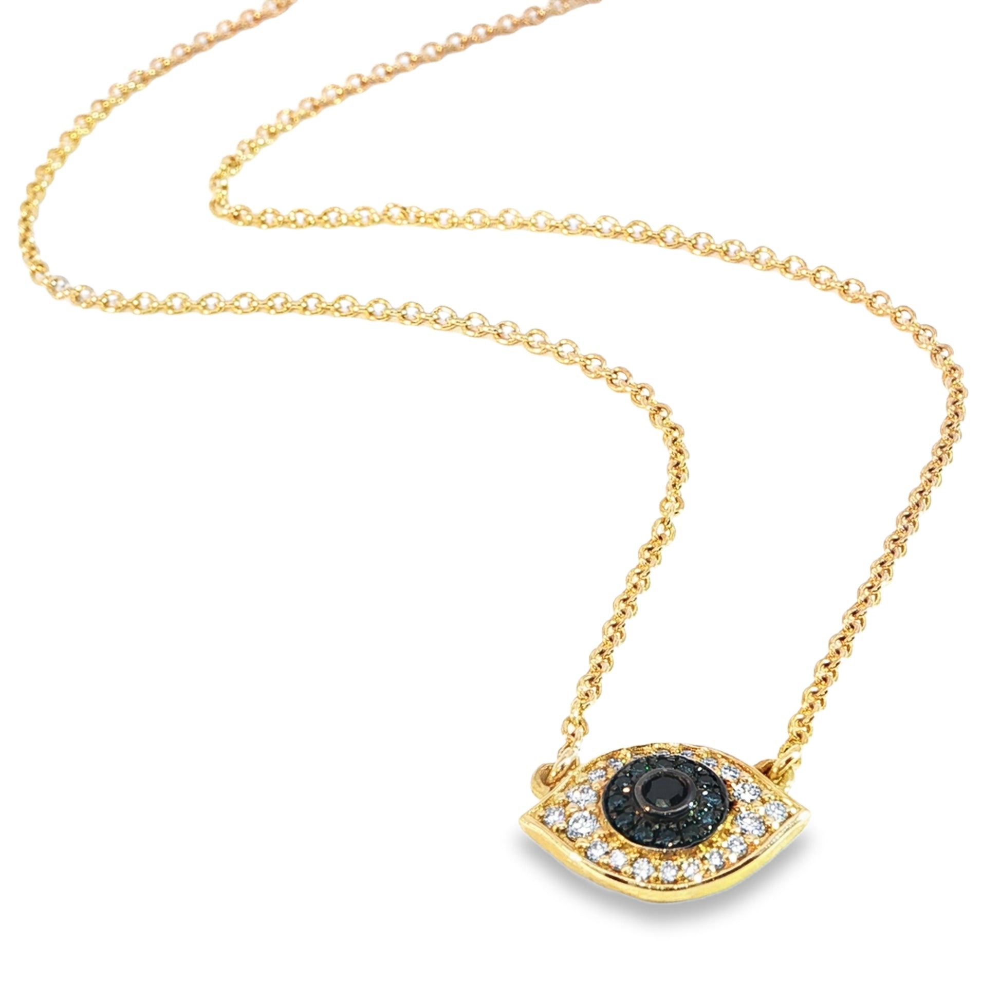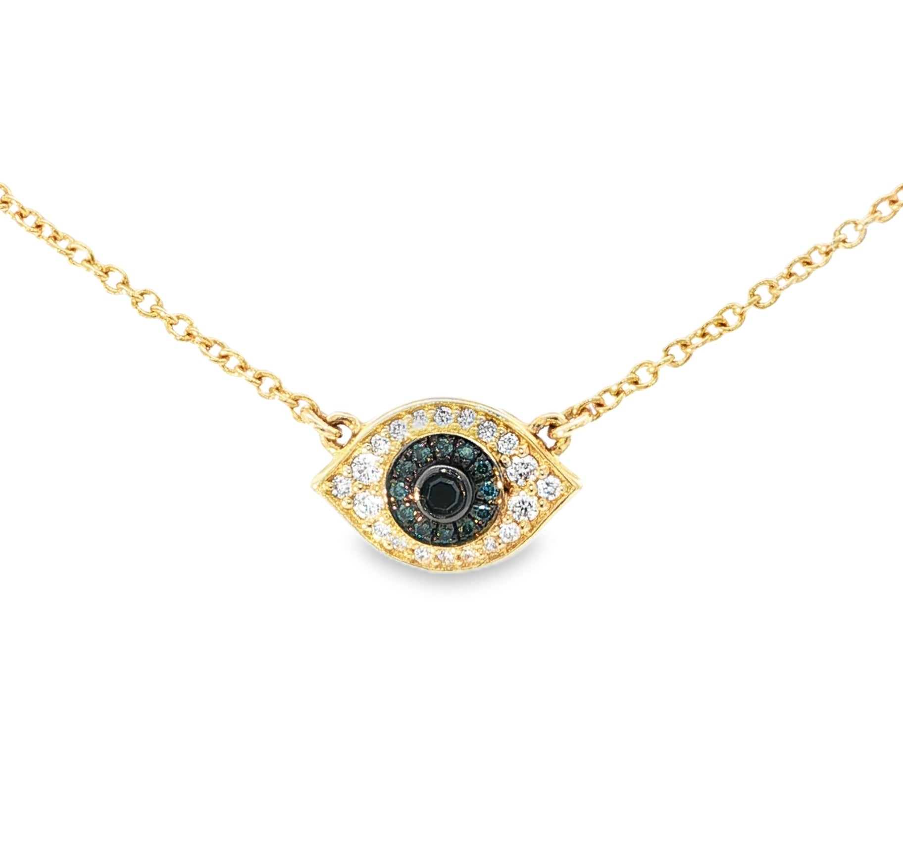 Stunning blue diamonds surround a single black diamond in the center of this evil eye motif, beautifully accented with white diamonds around are sure to reflect evil.