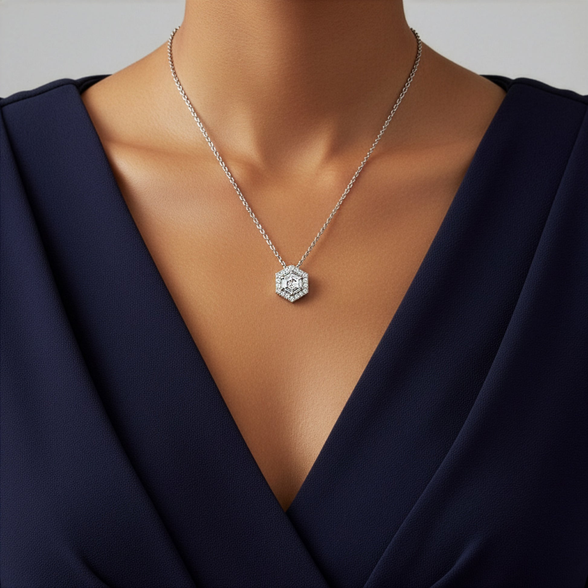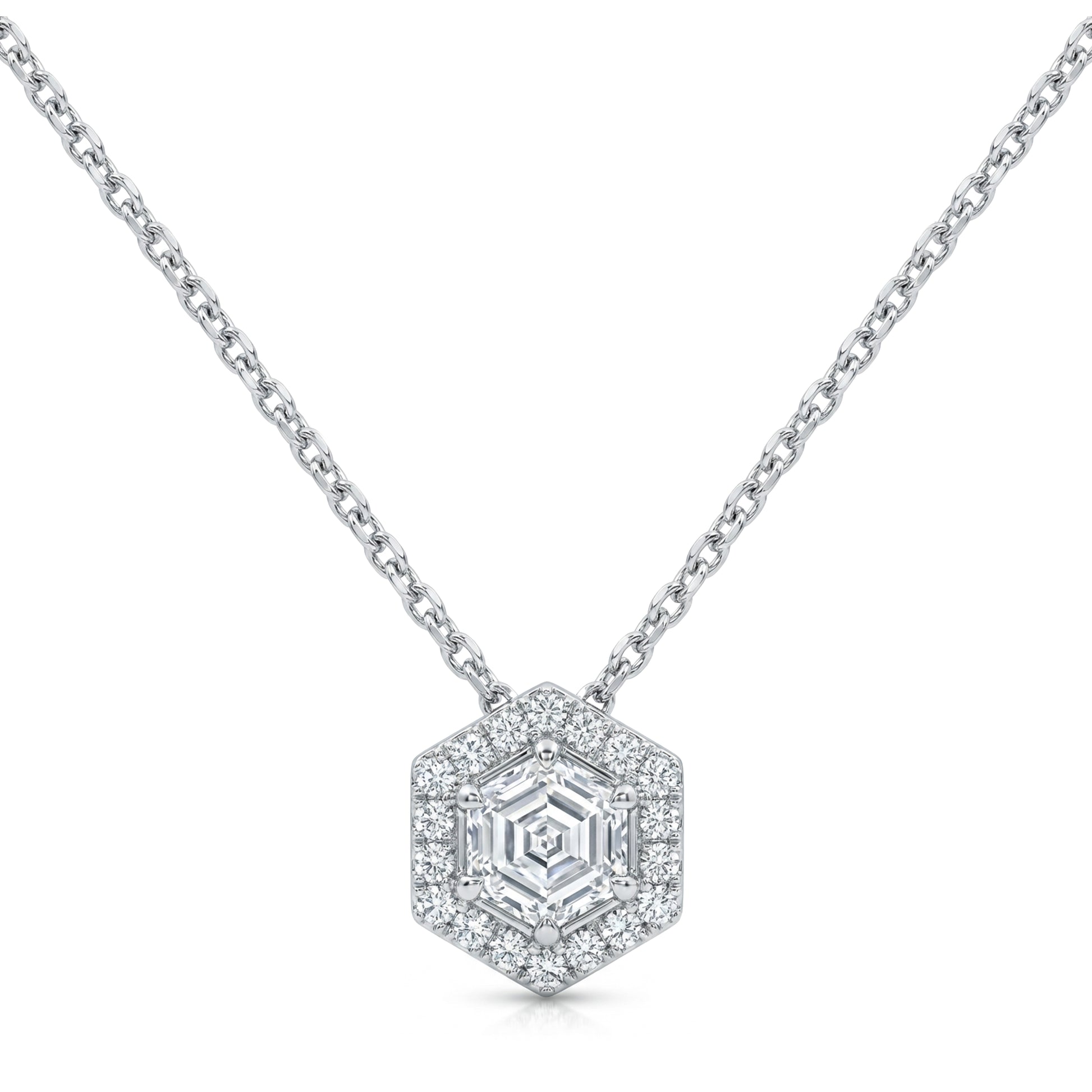 Rare hexagon shaped diamond set in a beautiful white gold pendant surround by round brilliant diamonds. This pendant is a one of a kind piece and will add that extra sparkle to every outfit.