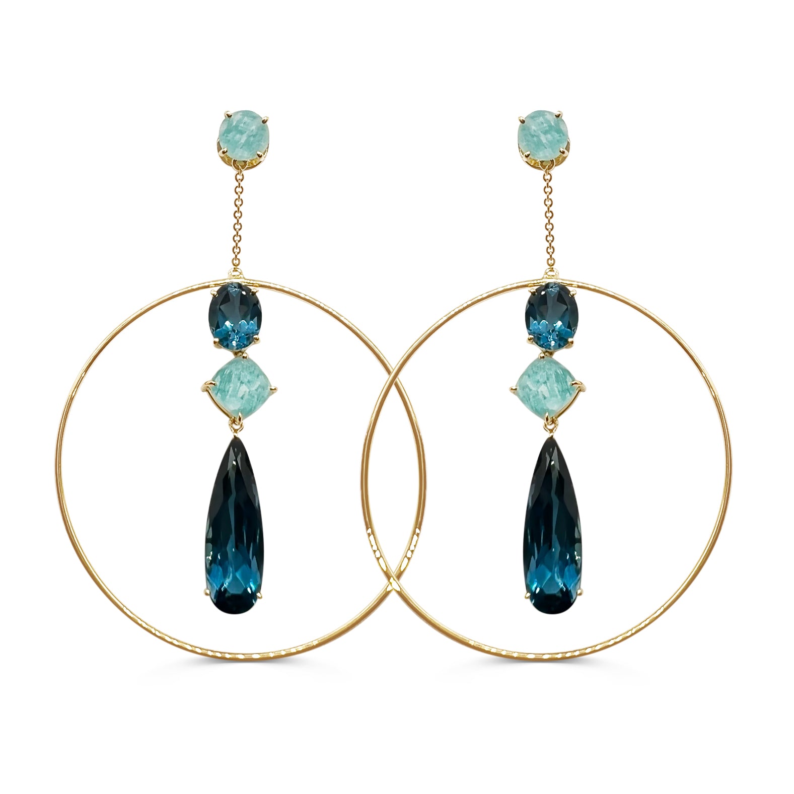 Be a vision in these eye-cathing London Blue Topaz Hoop earrings. The vibrant blue enclosed in a fine 18k yellow gold hoop is funky yet refined. The perfect statement to any look.