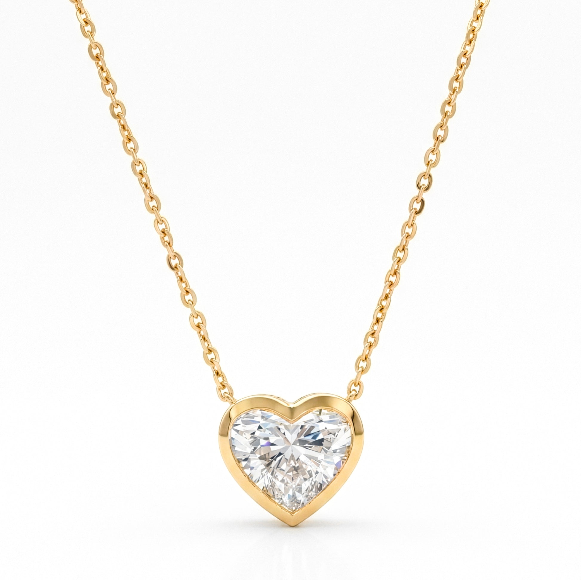 A heart-shaped lab grown diamond set in sleek in 14k yellow gold, suspended from a delicate chain. Timeless, radiant and effortlessly romantic.
