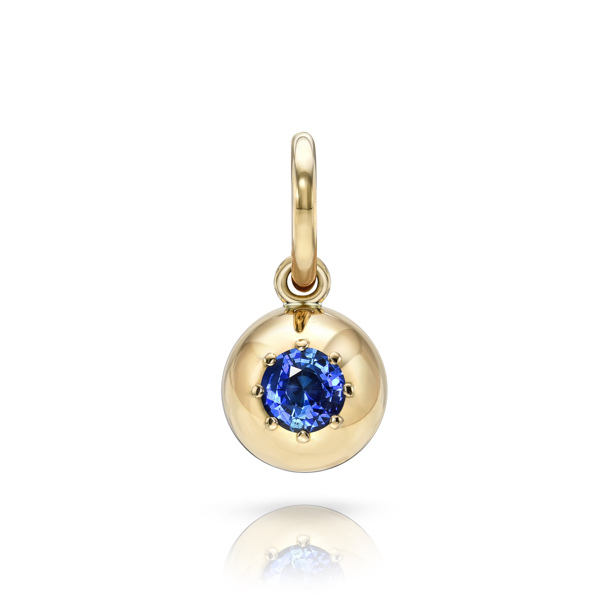 Handcrafted in yellow gold this round sphere shaped pendant set with a round sapphire feels comfortable and substantial. It is beautiful worn on our handmade chains such as the mini lo or rosary ball chain.