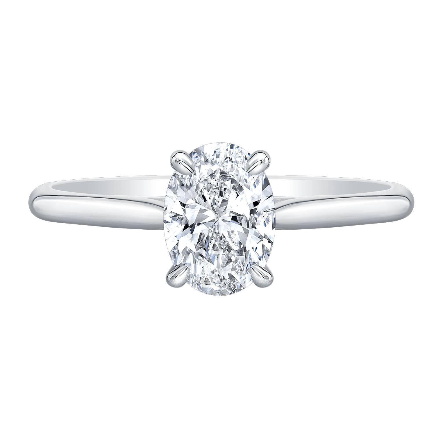 Classic solitaire brilliant Oval diamond of collection quality grade set in shiny platinum. Wear it alone or layer it with a variety of diamond, gem-set or plain bands.