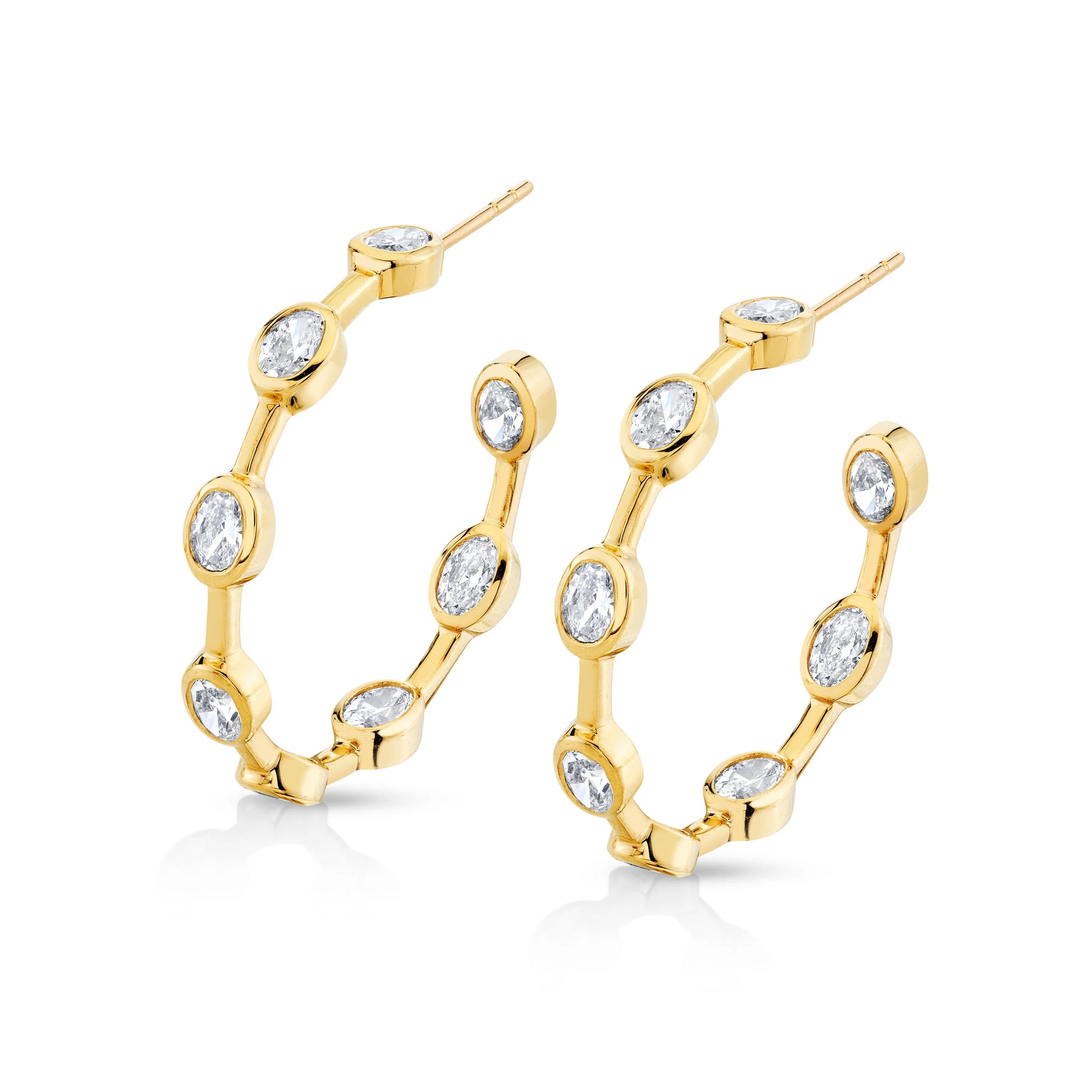 Elevate your elegance with our simple yet striking gold and diamond hoop earrings, where timeless design meets modern allure. Crafted in radiant 18k yellow gold, these stunning hoops are adorned with oval diamonds in a bamboo style setting. These hoops exude modern sophistication, the perfect touch to elevate any outfit. This versatile yet dazzling style can transport you from day to night. Perfect for the woman that's always on the go but loves to add a touch of sparkle to her day.