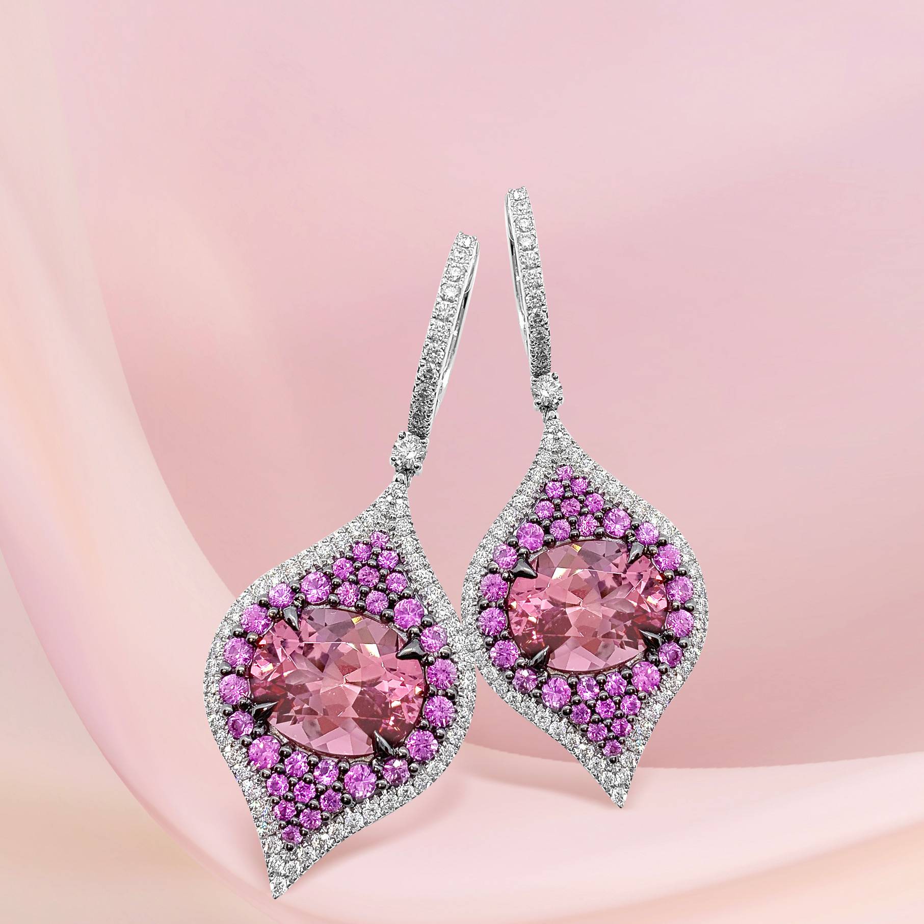 Glowing Pink Tourmalines surrounded by Exquisite Pink Sapphires create a vibrant pop of colour sure to brighten every outfit.
