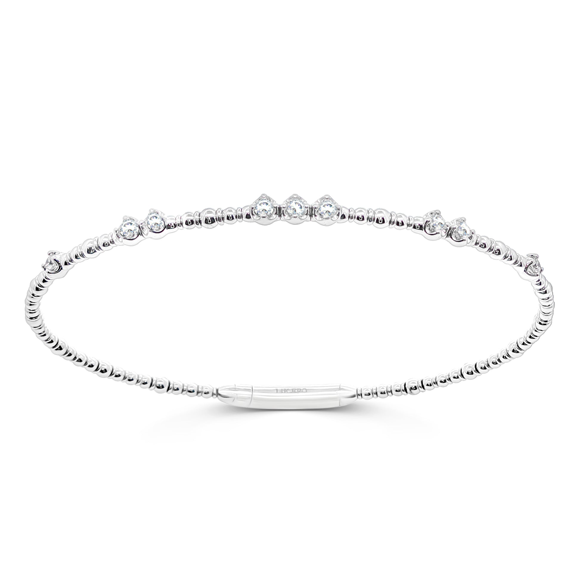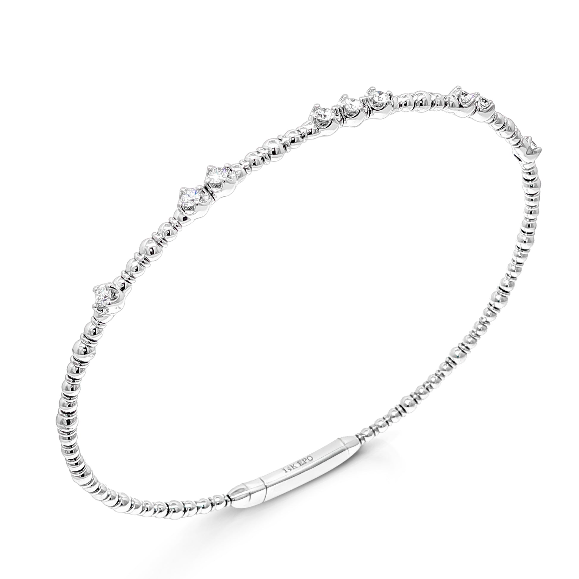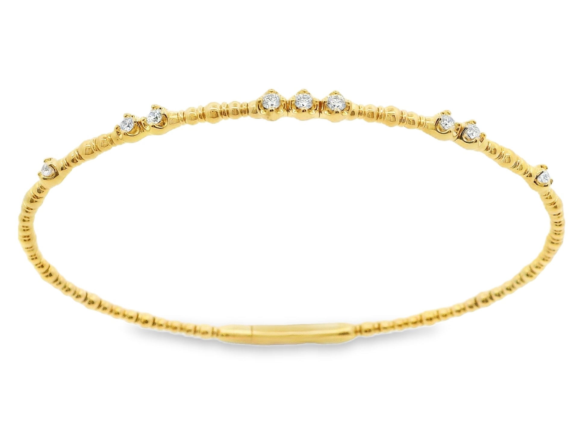 Elevate your style with this exquisite flexible bangle, crafted in lustrous 14k yellow gold. This elegant piece showcases the timeless beauty of round brilliant cut diamonds, gracefully set within the sleek design. A perfect addition to any jewelry collection, this bangle exudes sophistication and charm and is super comfortable to wear.